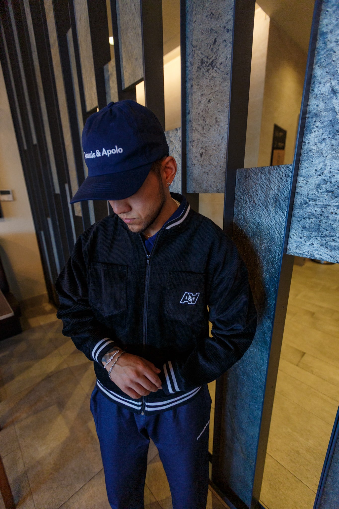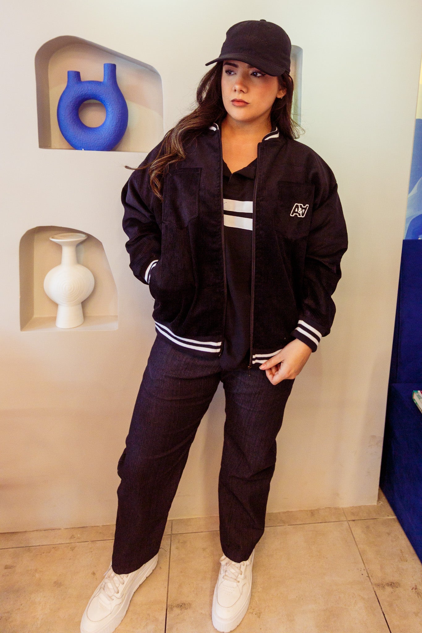 Los puños y basta con franjas blancas le dan ese guiño varsity clásico, mientras que el parche bordado A&A en el pecho sella la identidad de la marca. Es la capa perfecta para usar sobre poleras, polos o hoodies, y funciona igual de bien en un look full negro como combinado con denim o colores más vibrantes.