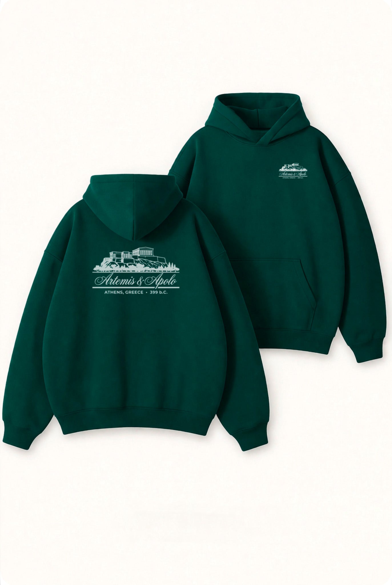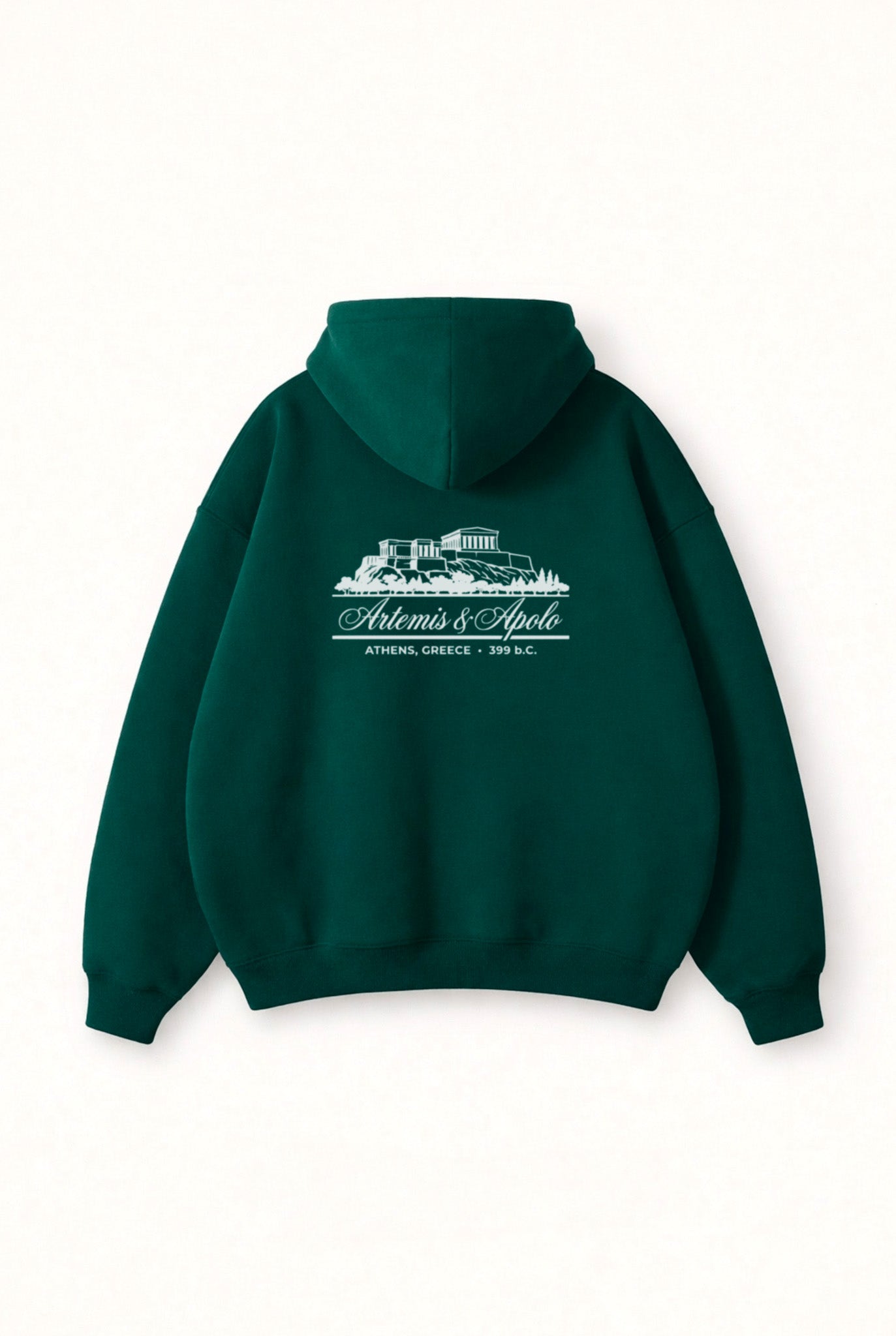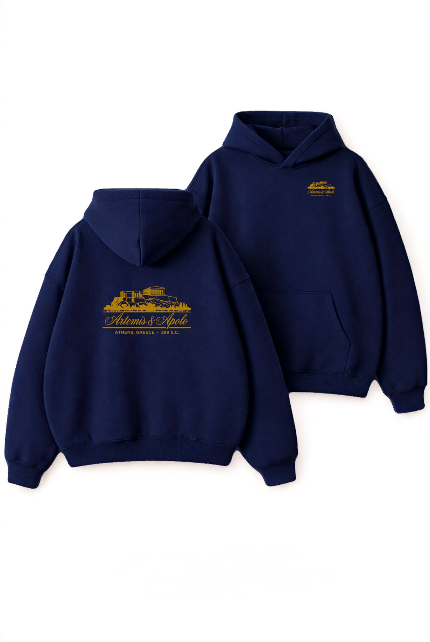 Un hoodie de estilo urbano con inspiración clásica. Un poleron y una polera que destacan por su diseño minimalista al frente y un estampado protagonista en la espalda con ilustración arquitectónica y detalles en tonos, evocando la esencia de la antigua Grecia.