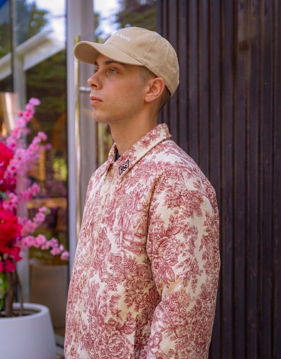 Confeccionada con una tela resistente y de textura suave, presenta un patrón detallado en burdeo sobre fondo marfil: escenas bucólicas, flores y figuras que evocan un encanto vintage con un toque contemporáneo.